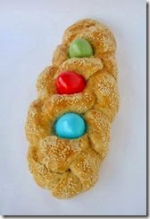 Greek Easter bread with colored eggs inserted in it, made with a 4 Strand Alpha Braid.